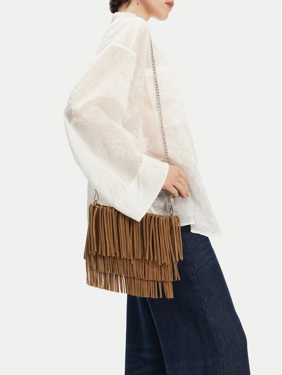 Елегантната чанта DeeZee в кафяв цвят е отличен избор за жени, които ценят стил и функционалност. Изработена от висококачествен текстилен материал, тя се характеризира с твърда структура, която осигурява издръжливост и елегантен вид. Малкият размер на чантата я прави идеална за ежедневна употреба, а отделението със закопчалка гарантира безопасно съхранение на необходимите предмети. Декоративните ресни й придават уникален характер, а допълнителната каишка позволява носене по удобен начин. Това е чанта, която съчетава модерен дизайн с ежедневна практичност.